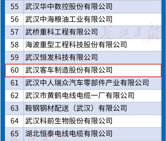 ? ? ? 9月25日,經(jīng)過武漢企業(yè)聯(lián)合會、武漢企業(yè)家協(xié)會聯(lián)合長江日報報業(yè)集團、武漢廣播電視臺、武漢發(fā)展戰(zhàn)略研究院共同組織,在遵循企業(yè)自愿申報原則的基礎(chǔ)上,以2019年度營業(yè)收入為依據(jù),“2020年武漢企業(yè)100強(綜合百強)”、“制造業(yè)企業(yè)100強(制造業(yè)百強)”、“服務(wù)業(yè)企業(yè)100強(服務(wù)業(yè)百強)” 排序榜正式發(fā)布。武漢客車制造股份有限公司位列2020武漢制造業(yè)企業(yè)第六十名!